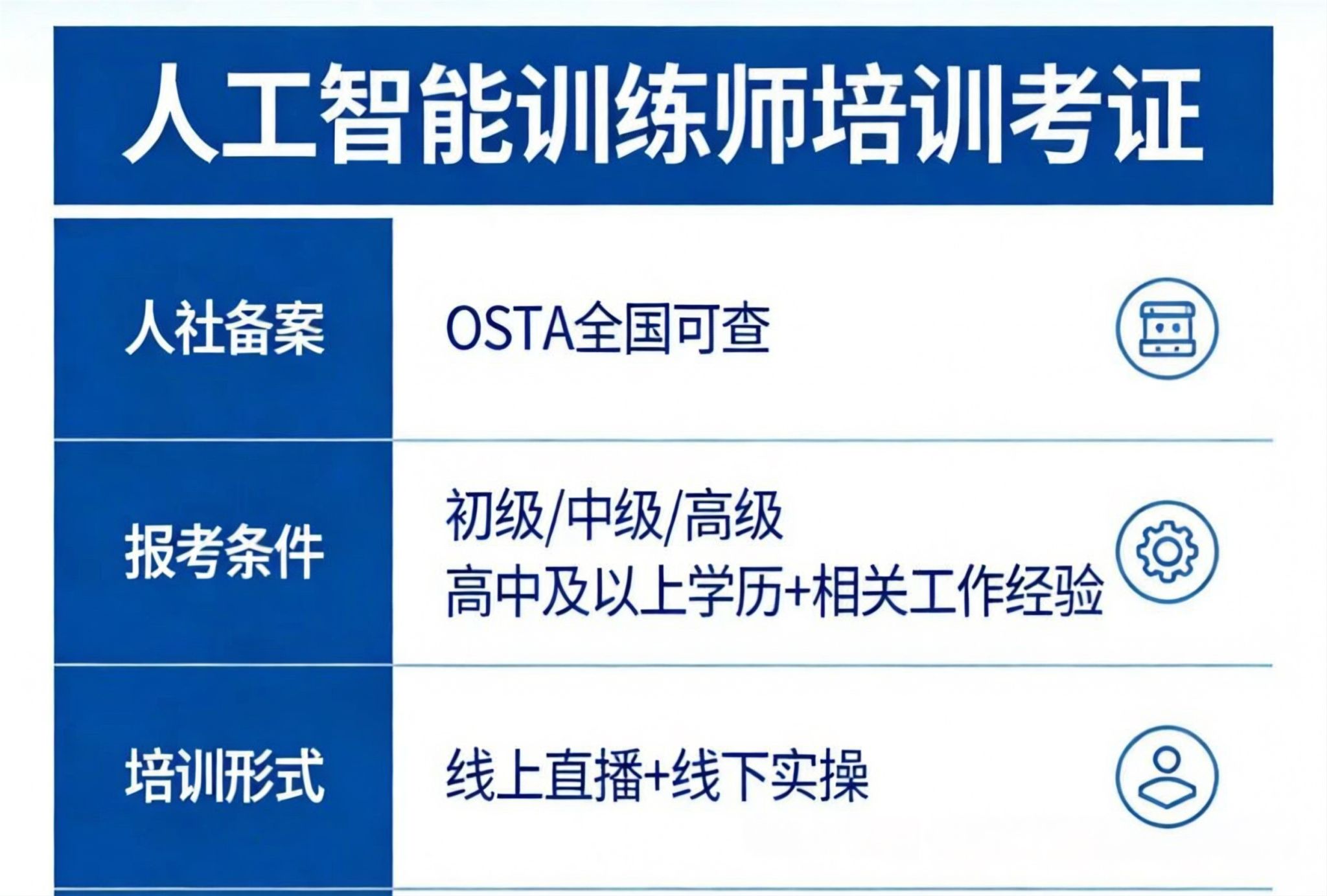 人工智能训练师培训考证项目为人社部备案第三方评价认证项目,证书纳入OSTA全国技能人才评价体系,全国联网可查、终身有效。