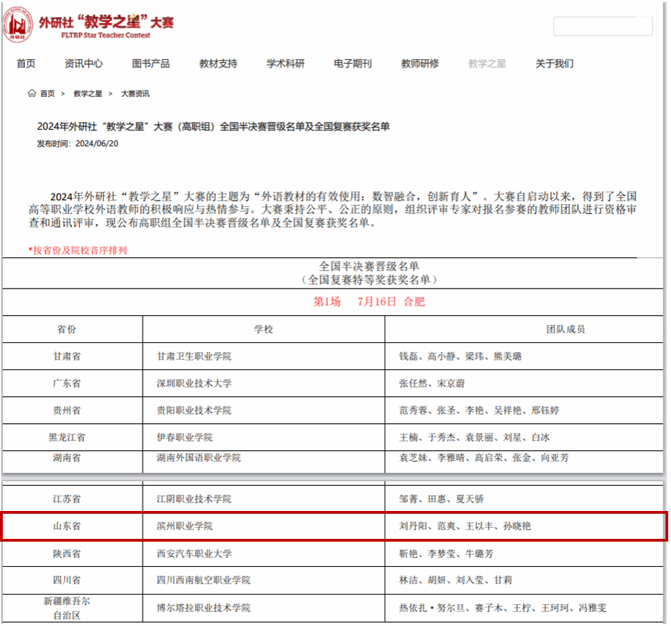 近日,2024年外研社“教学之星”大赛(高职组)全国复赛在线上进行。tyc41183太阳成集团外语团队喜获特等奖,进入全国半决赛。