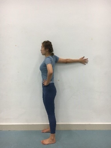 ·内侧手臂水平向后伸展到最大幅度,手掌扶墙。外侧手掌扶髋。调整俩肩的延长线垂直于墙面,找到内侧手掌带动肩膀向后的伸展感。