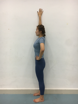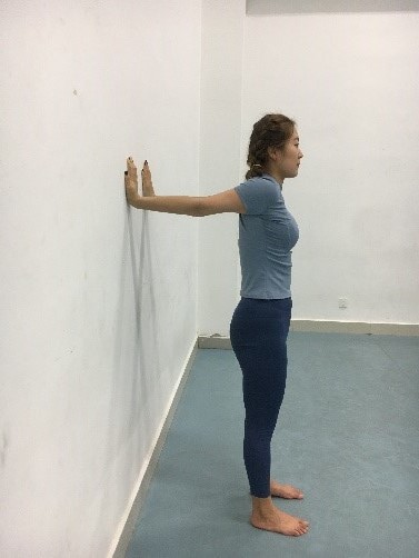 ·保持俩脚不动,双腿垂直于地面,两手依次沿墙向上到最大幅度,微收下颌,使颈部在脊柱的延长线,找到腋窝、肩膀、背部的伸展感。