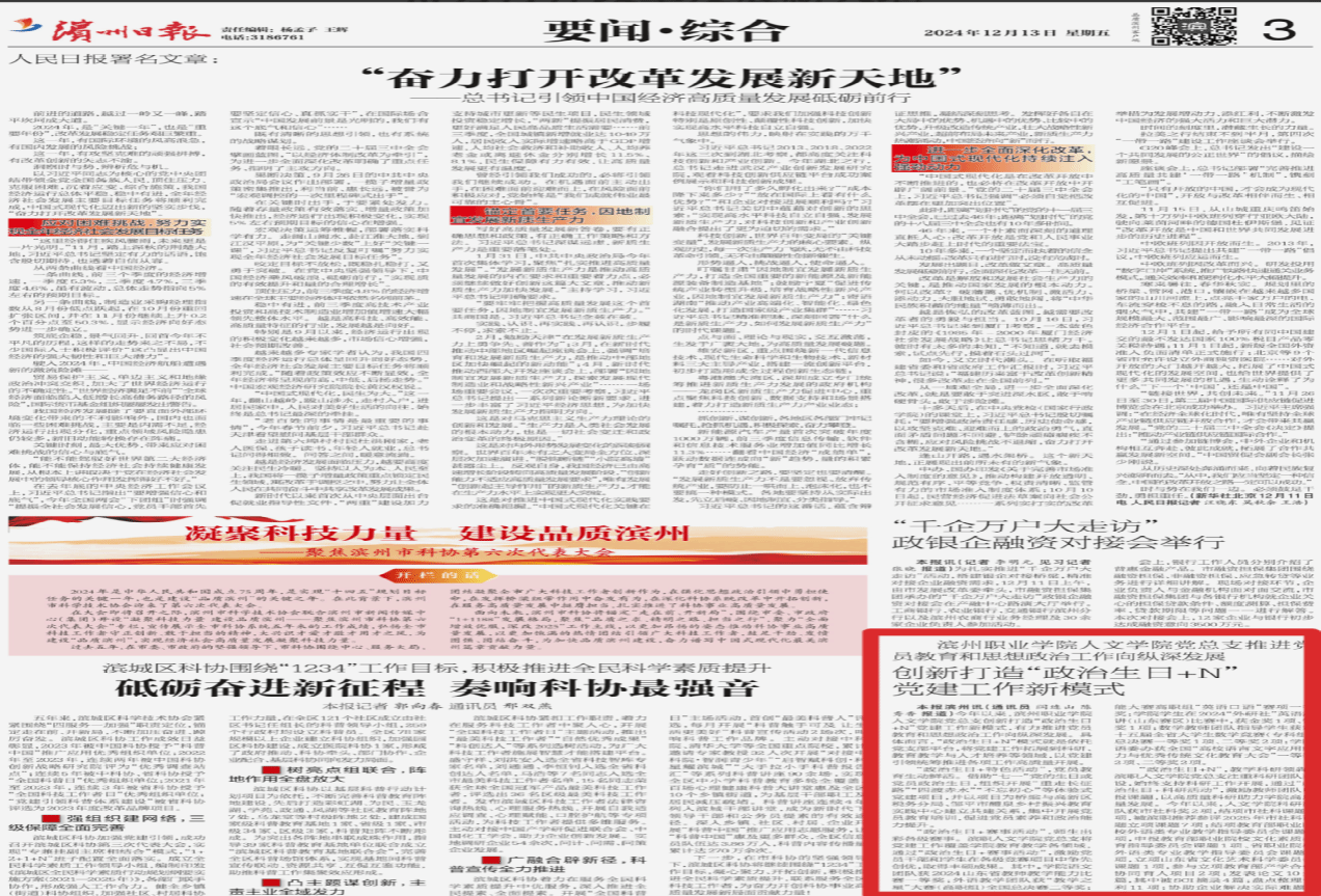 本网tyc41183太阳成集团讯  11月13日,tyc41183太阳成集团2024年度党建创新品牌“政治生日+N”党建工作创新模式被滨州日报《要闻·综合》版报道,全面介绍了tyc41183太阳成集团党总支推进党员教育和思想政治工作新经验。